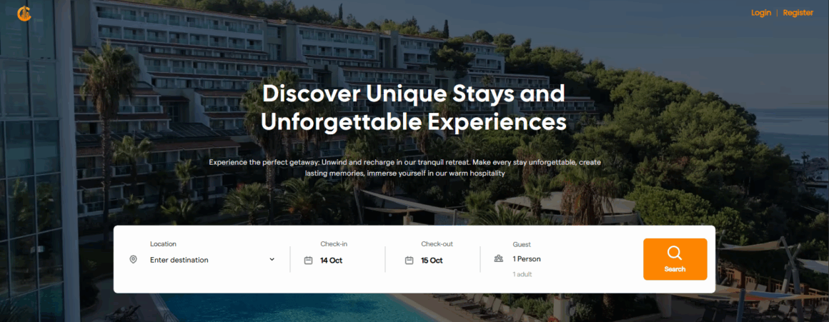 First, when you open our website in your browser, you’ll see a rectangular box with the options: Enter destination, Check-in and Check-out dates, and Number of guests.
